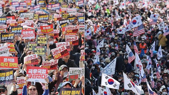 ▲ 왼쪽은 서울 종로구 경복궁 동십자각에서 윤석열 즉각퇴진·사회대개혁 비상행동(비상행동)이 연 15차 범시민 대행진, 오른쪽은 서울 세종대로에서 대한민국바로세우기운동본부가 연 광화문 국민대회.