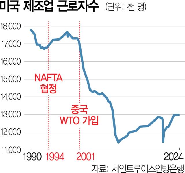 이전에도 이와 관련한 내용을 말씀드린 적이 있는데요.(★관련 기사 ‘넘쳐난 중국산이 삶을 망쳤다’...무너진 아메리칸드림, 무역질서 뒤흔들다 [Datareport]) 미국의 제조업 고용 추세를 한번 보시죠. 아래는 이를 나타내는 그래프입니다.
