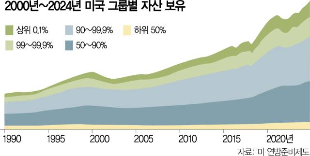 아래의 그래프를 한번 보시죠. 미국의 상위 0.1%에서 하위 50%까지 소득 수준별로 나눠 2000년부터 2024년까지 각 계층의 자산이 어떻게 변했는지 나타내는 그림입니다. 위쪽부터 표시된 세 가지 색깔(짙은 녹색, 연한 녹색, 청회색)이 포함한 영역이 점점 커지는 것을 볼 수 있을 겁니다. 이는 상위 10%가 가지는 총 자산입니다. 2024년 3분기 기준 약 112조 달러 규모입니다. 5년 전보다 43% 늘어났습니다. 전체 중 67.3%에 해당합니다. 상위 10%가 전체 부의 약 70% 가까이를 가지고 있다는 의미입니다.