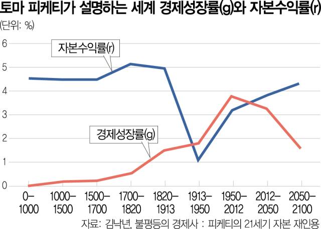 그가 설명하는 불평등 원인을 간단하게 말하면 이렇습니다. 자본수익률(r)이 경제성장률(g)보다 높아(r > g) 불평등이 누적됐다는 겁니다. 즉 이자, 배당, 임대료 등 재산을 가지고 벌어들이는 수익률이 경제성장률보다 높다보니 부를 가진 사람들은 점점 더 풍족해지는 반면 노동소득에 의존하는 경우 뒤떨어지고 있다는 설명입니다. 또 향후 추세적으로 경제성장률이 떨어질 것으로 예상돼 부의 불평등도 심화할 것으로 내다봅니다. 아래 그래프를 참고하시면 될 거 같습니다. 김낙년 교수 논문(불평등의 경제사: 피케티의 21세기 자본)에서 재인용한 그림입니다. 아래 그림에서 보면 역사적으로 자본수익률은 약 4~5% 수준이며 경제성장률보다 높은 수준에 있습니다. 이를 통해 부의 불평등을 확대한다는 설명입니다.