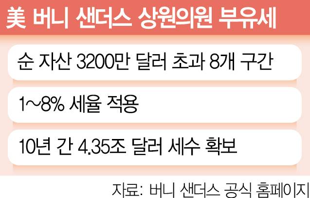 부의 격차, 불균형 문제를 개선하려면 어떻게 해야 할까요? 관련 이슈가 커질 때마다 해결책으로 거론되는 것이 바로 부유세(Wealth Tax)입니다. 고소득을 올리고 상당한 자산을 가진 이들에게 높은 세금을 적용해 벌어진 격차를 줄이자는 주장이죠. 미국에서는 버니 샌더스 상원의원, 엘리자베스 워런 상원의원이 부유세 도입을 주장하는 대표적인 인물로 꼽힙니다. 아래 표는 샌더스 의원이 내세운 부유세 정책의 대략적인 내용입니다. 부유세를 통해 부의 격차를 줄이고 국가의 세수까지 늘릴 수 있다는 주장입니다.