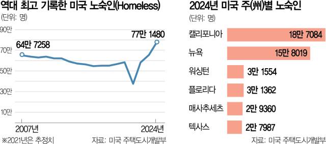 미국에서 노숙인 문제가 심각하다고 했는데요. 이는 통계에서도 확인되는 현상입니다. 미국 주택도시개발부(HUD)에 따르면 2024년 미국 전역의 노숙인은 77만 1480명입니다. 2023년 대비 18.1%가 늘었습니다. HUD는 2007년부터 관련 통계를 공개하고 있는데 지난해 노숙인 수치는 역대 최대치입니다. 앞서 2023년 통계에서도 역대 최대라고 밝힌 바 있는데요. 1년 만에 해당 기록을 경신한 것이죠. 치솟는 집값, 늘어나는 이민자, 높은 인플레이션, 정체된 임금, 노숙자 지원 프로그램의 종료 등이 사태에 영향을 줬다고 당국은 파악하고 있습니다.