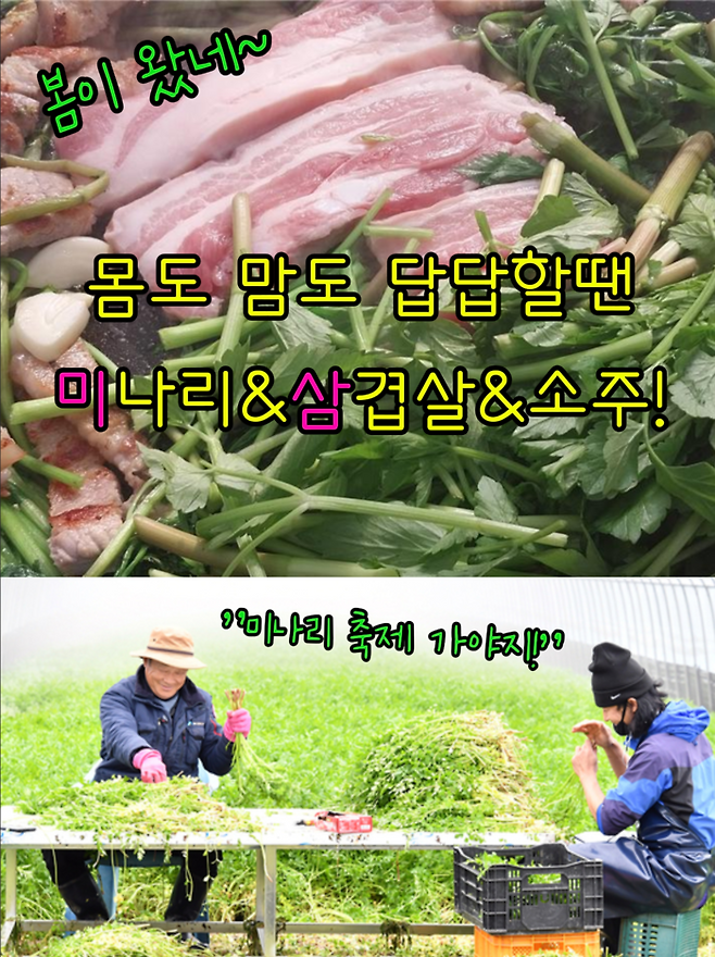 해외여행도 좋지만 초록초록한 미나리와 삼겹살 드시고 주변 관광지도 다니면서 어려운 지역경제를 살리는 데 조금이라도 도움을 보태보면 어떨까요!!