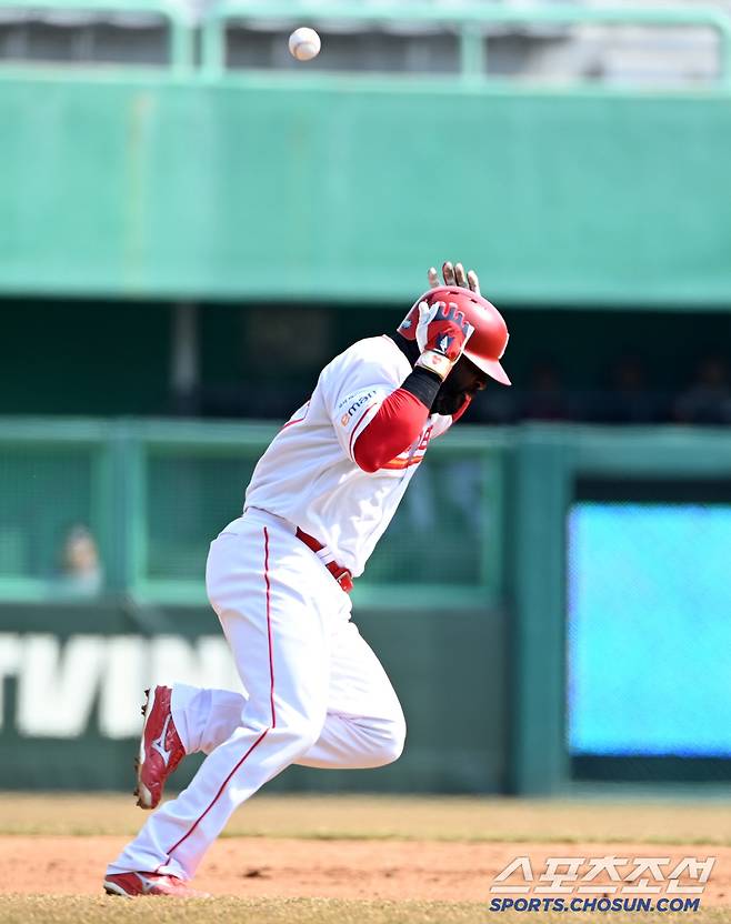 16일 인천SSG랜더스필드에서 열린 시범경기 LG와 SSG의 경기, 3회말 1사 2루 SSG 하재훈 타석때 2루주자 에레디아가 협살에 걸리다 송구를 헬멧에 맞고 있다. 인천=허상욱 기자wook@sportschosun.com/2025.03.16/