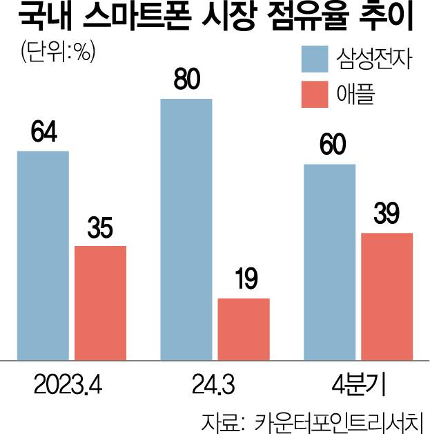 시장조사 기관인 카운터포인트리서치에 따르면 지난해 4분기 애플의 한국 스마트폰 시장 점유율이 39%에 달했다. 이는 분기 기준 역대 최고치인 2023년 4분기의 35%를 훌쩍 뛰어넘은 것이다. 애플의 약진에 삼성전자는 같은 기간 점유율이 64%에서 60%로 내려 앉았다.