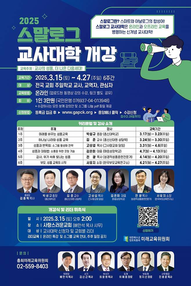 대한예수교장로회(예장) 합동(총회장 김종혁 목사)은 15일 ‘스말로그 교사대학’을 개강했다. 스말로그는 스마트와 아날로그의 합성어로, 온라인과 오프라인 수업을 병행하는 통합 수업을 말한다. 미래교육위원회 주관으로 진행하는 이번 행사는 ‘교사의 성품, 더 나은 미래세대’를 주제로 진행하며 서울 대구 부산 광주 등 전국 132개 교회의 1500여명 교사가 참여한다. 3년 전 시작한 스말로그 교사대학에 첫해 500여명의 교사가 신청했고 매년 그 숫자가 증가하고 있다.