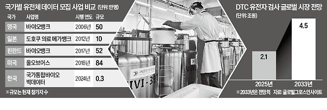 유전체 데이터는 취약한 질병의 대응책을 마련하고, 환자 개인에게 가장 잘 듣는 신약을 개발하는 데 필수 요소다. 최근 인공지능(AI) 신약 개발이 등장하면서 중요성이 더 커지고 있다. 영국은 2006년부터 바이오뱅크 사업을 도입해 50만 명 이상의 유전체 데이터를 확보했다. 이를 토대로 희소질환, 암, 전염병의 유전적 원인을 밝히기도 했다. 핀란드는 자국민의 약 10%인 20만 명의 유전체 데이터를 확보했으며, 미국도 84만 명의 데이터를 확보해 연구자와 기업들이 활용할 수 있게 돕고 있다. 글락소스미스클라인(GSK), 암젠, 리제네론 등 글로벌 대형 제약사는 이들 국가의 데이터를 활용해 신약을 개발하고 있다.