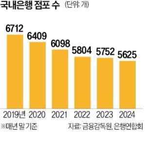 금융감독원 금융통계정보시스템 및 은행연합회에 따르면 국내은행 점포는 2019년 6712개에서 지난해 5625개로 5년 만에 1087개 줄었다. 특히 같은 기간 국민·신한·우리·하나 등 4대 시중은행 국내 영업점은 3525개에서 2779개로 21.2% 감소했다.