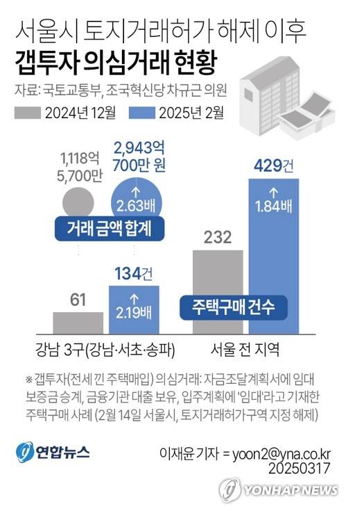 (서울=연합뉴스) 오규진 기자 = 서울시가 지난달 강남 3구(강남·서초·송파구) 토지거래허가제를 완화한 가운데, 갭투자(전세 낀 주택매입) 의심 주택구매 건수가 이전보다 두 배 넘게 증가했다고 조국혁신당 차규근 의원이 17일 밝혔다.
