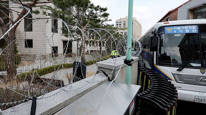 ▲ 헌법재판소의 윤석열 대통령 탄핵 심판 선고가 임박한 가운데 16일 서울 종로구 헌법재판소 울타리에 철조망이 설치되어 있다.