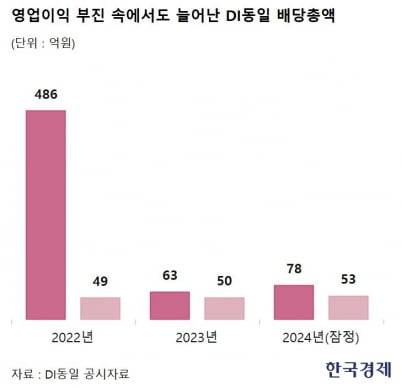 하지만 주당 250원의 현금 배당은 이어가고 있다. 2022년 8.6%였던 배당성향이 225.5%에 이르게 된 이유다. 배당총액도 2022년 49억원에서 2023년 50억원, 2024년 53억원으로 늘어났다. DI동일 측은 "지속적인 배당 정책을 유지해 주주들의 신뢰를 얻기 위한 것"이라며 "2015년과 2017년에는 별도 기준으로 순손실을 입었지만 배당금을 지급한 바 있다"고 설명했다.