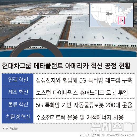 [서울=뉴시스] 미국 조지아주에 들어서는 '현대차그룹 메타플랜트 아메리카(HMGMA)' 가 이달 말 준공식을 열고, 본격 가동에 돌입한다. HMGMA의 혁신 시스템은 삼성전자와 협업해 구축한 '5G 특화망 레드캡'이 대표적이다. 연말에는 HMGMA에 휴머노이드 로봇 '올 뉴 아틀라스'도 시범 적용할 예정이다. (그래픽=안지혜 기자)