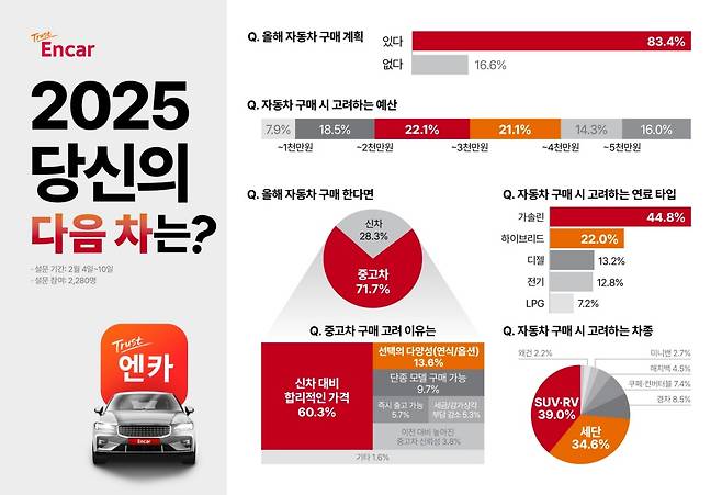 이번 설문조사는 올해 소비자들의 자동차 구매 계획과 구매 시 고려 요소를 알아보기 위해 지난 2월4일부터 10일까지 총 2,280명을 대상으로 진행했다. 먼저, 올해 차를 구매할 계획이 있다고 답한 응답자는 전체의 83.4%였다. 이 중 중고차를 고려하는 응답자는 71.7%로 중고차 선호도가 압도적으로 높은 것으로 드러났다.