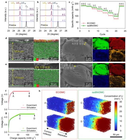 연구팀은 리튬이온과 약한 결합을 하는 isoBN 용매를 도입, 용매화 구조를 조절하고 음극 계면층 형성을 최적화함으로써 리튬이온 이동성을 높였습니다.