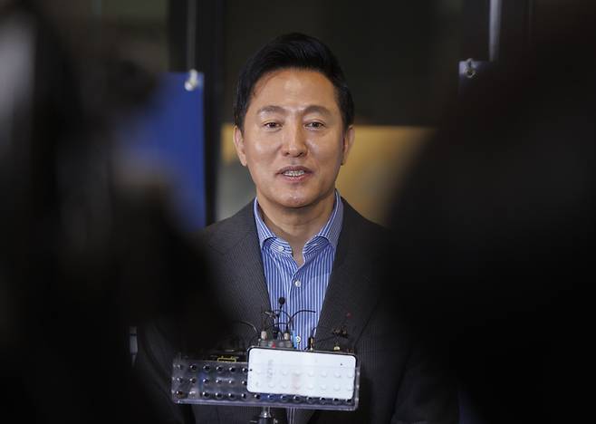 | ▲ 오세훈 서울시장이 12일 서울 강서구 서울창업허브 M+에서 열린 서울 바이오 혁신포럼에 참석한 뒤 개회사 도중 오 시장이 언급한 '조기 대선' 관련 질문에 답하고 있다. 2025.3.12 |