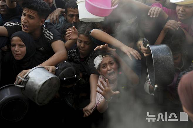 [베이트 라히야=AP/뉴시스] 16일(현지 시간) 가자지구 북부 베이트 라히야 식량 배급소에서 어린이들을 비롯한 팔레스타인 난민들이 구호 음식을 받기 위해 필사적으로 몰려들고 있다. 2025.03.17.