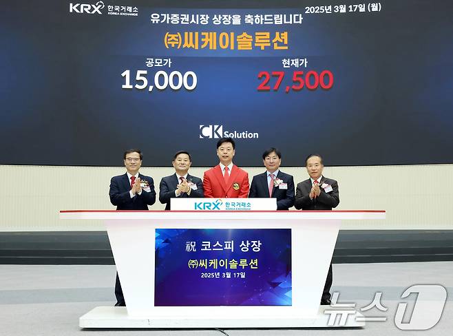 (서울=뉴스1) = 17일 서울 영등포구 한국거래소에서 열린 씨케이솔루션의 유가증권시장 신규 상장기념식에서 현재가 확인 후 정석호 한국IR협의회 회장(왼쪽부터), 양태영 한국거래소 유가증권시장본부장, 김유곤 씨케이솔루션 대표이사, 이성 NH투자증권 IB1사업부대표, 이기헌 상장회사협의회 부회장이 기념 촬영을 하고 있다. (한국거래소 제공. 재판매 및 DB 금지) 2025.3.17/뉴스1