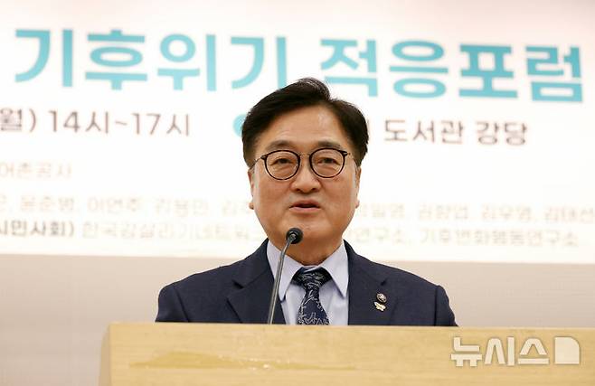 [서울=뉴시스] 조성우 기자 = 우원식 국회의장이 17일 오후 서울 여의도 국회도서관에서 열린 국가 기후위기 적응포럼 연속토론회에서 축사하고 있다. 2025.03.17. xconfind@newsis.com