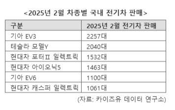 차종별로 보면 지난 2월 국내에서 가장 많이 팔린 전기차는 기아 EV3로 2257대를 기록했다. 2위는 2040대의 판매실적을 낸 테슬라 모델Y였다. 이 밖에 현대차 포터Ⅱ 일렉트릭(1532대), 현대차 아이오닉5(1463대), 기아 EV6(1100대), 현대차 캐스퍼 일렉트릭(1061대) 등이 1000대 이상의 판매고를 기록했다.