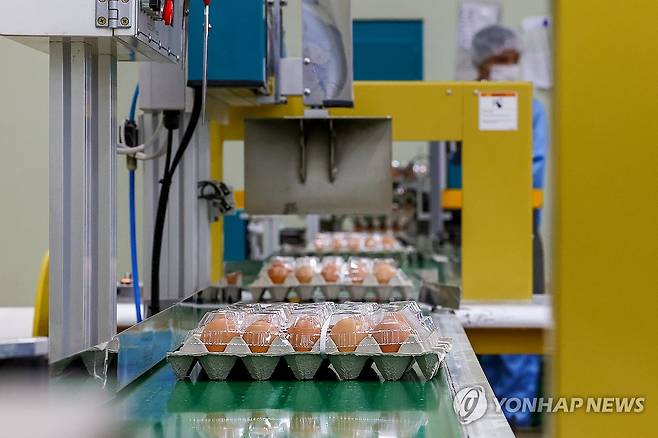 (아산=연합뉴스) 서대연 기자 = 조류독감 유행으로 심각한 달걀값 폭등을 겪고 있는 미국 당국이 유럽과 아시아 국가 등에 계란 수입을 타진하고 있는 가운데 17일 국내 최초로 달걀을 미국에 수출한 충청남도 아산시 계림농장에서 직원들이 달걀을 포장하고 있다.