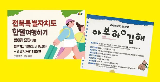 도심을 벗어나 지역에서 한 달 살기 체험을 해볼 수 있는 지방자치단체 지원 프로그램이 참가자 모집에 속속 나서고 있다. 숙박비와 활동비, 여행자 보험 등 각종 경비를 지원한다. 지역 관광 자원 홍보 목적이나 귀농귀촌인들이 예비 체험을 위한 목적으로도 활용할 수 있다.