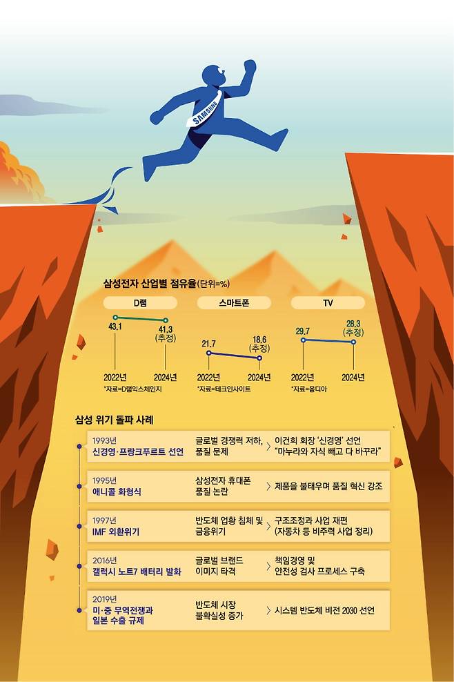 그만큼 위기 대응력이 그 어느 때보다 절실하다. 삼성전자가 공시한 사업보고서에 따르면 TV부터 스마트폰, D램, 스마트폰 패널, 차량용 디지털 콕핏까지 대부분 산업별 점유율에서 빨간불이 켜진 상태다. 예를 들어 TV는 1등이기는 하지만 중국의 저가 공세로 점유율이 2023년 30.1%에서 2024년 28.3%로 줄었다. D램 역시 2022년 43.1%에서 2024년 41.3%로 하락했다. 스마트폰 패널도 위협받고 있다. 2023년 50.1%에서 2024년 41.3%로 밀려났다.