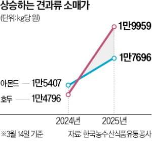 아몬드 가격도 전년 동기 대비 상승했다. aT 기준 수입 아몬드 소매 가격은 14일 ㎏당 1만7696원으로 1년 전 동기(1만5407원)보다 14.8% 올랐다. 유통업계 관계자는 “지난해 미국에서 가뭄이 심화해 아몬드 정상품 출하량이 급감했다”며 “또 다른 산지인 호주는 지난해 인도와 자유무역협정(FTA)을 체결하면서 인도 내 호주산 아몬드 수요가 급증해 시세 상승이 예상된다”고 설명했다.