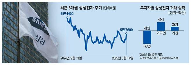 이는 삼성전자가 위기론에 봉착하며 외국인이 계속해서 주식을 매도했기 때문이다. 최근 6개월(2024년 9월 13일~2025년 3월 13일) 동안 외국인은 삼성전자를 17조9901억원어치 순매도했다. 반면에 같은 기간 개인은 12조3093억원, 기관은 1조7076억원어치 순매수에 나섰다.