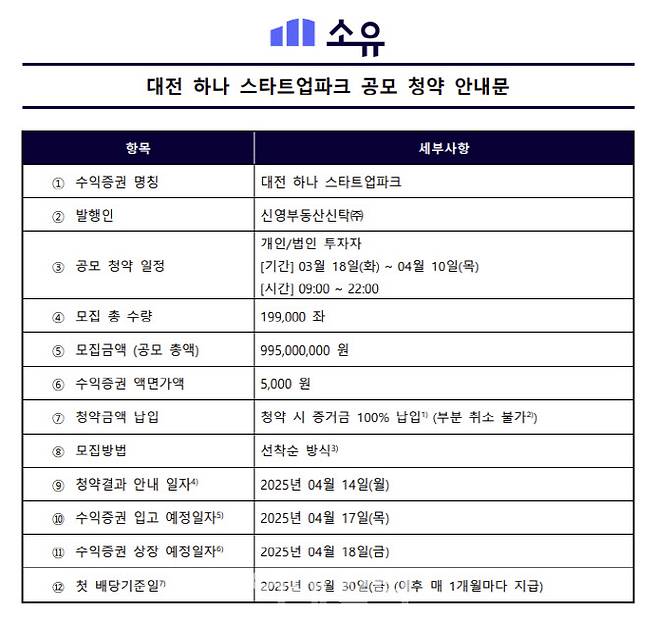 [이데일리 마켓in 김연서 기자] 부동산 토큰증권 플랫폼 ‘소유’ 운영사 루센트블록이 올해 첫 부동산 조각투자 공모를 시작한다. 대전광역시, 하나금융그룹과 협업한 지역 상생 조각투자 모델을 선보였다. 연 9% 수익률에 지역 상생 모델을 내건 이번 공모 청약이 성공적으로 마무리될 수 있을지 주목된다.