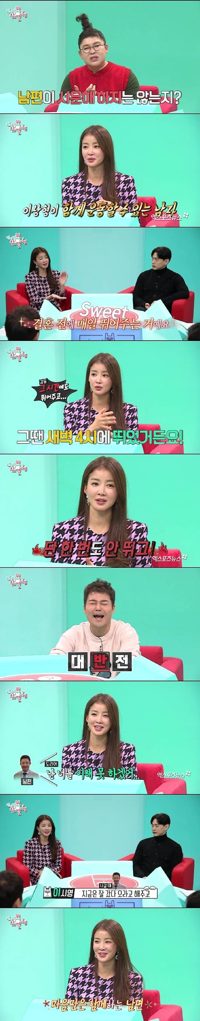 그러면서 "남편이 결혼 전에 매일 아침 새벽에 뛰어줬다. 새벽 4시에 뛰었는데 그때도 나와주고 뛰어주고 그런데 결혼 후에는 단 한번도 안 뛰고 내게 '난 너를 잘 이해 못하겠다'라고 했다"라고 말해 주위를 웃겼다.