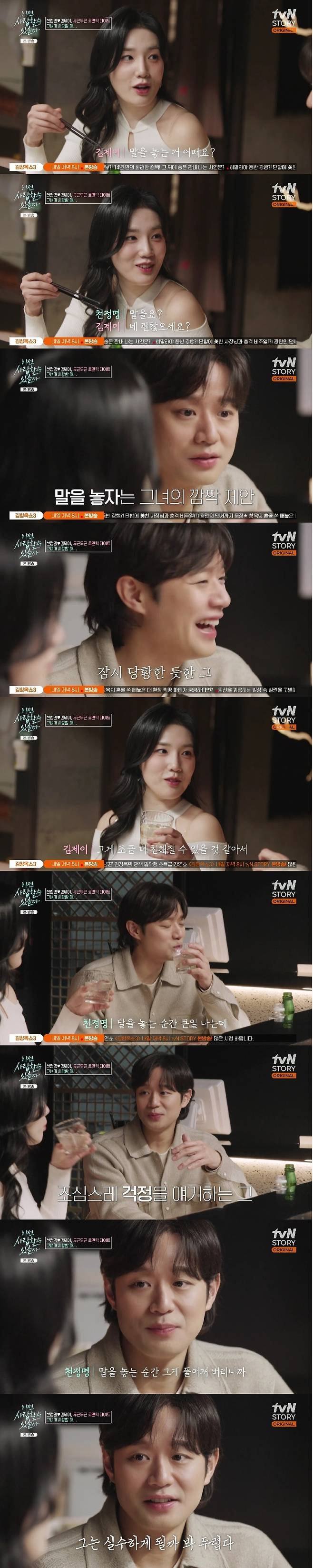 김제이는 "말 놓는 거 어떠냐. 괜찮냐"라며 제안했다. 천정명은 "뭐 편안하게 하고 싶으면"이라며 잠시 당황한 듯 웃었다. 김제이는 "그게 조금 더 친해질 수 있을 거 같아서"라며 강조했다.