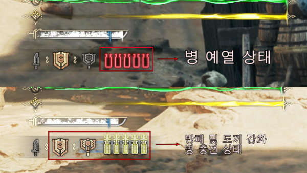 방패 강화는 굉장히 간단하다. 검 모드로 공격 시 스태미나 아래 병 UI의 외곽 테두리 색깔이 변한다. 병 UI 색이 빨간색으로 변했을 때 차지를 꾹 누르면 일정 시간 동안 방패가 강화된다. 병 충전은 같은 방법으로 병 UI 색이 변했을 때 차지를 한 번만 누르면 된다.