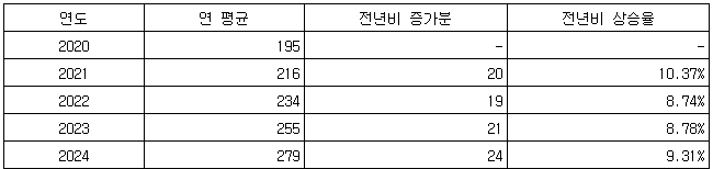 [표] 2020~2024년 전국 아파트 장기수선충당금 추이 (단위:원/㎡)