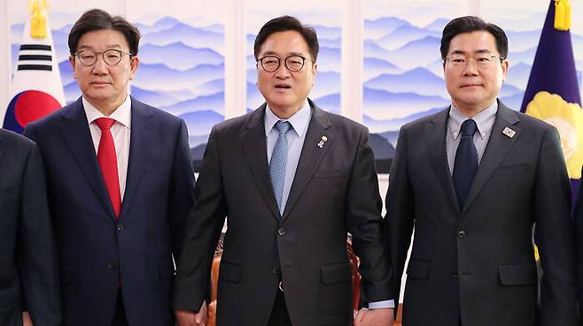 ▲ 기념 촬영하는 우원식 국회의장-박찬대 원내대표-권성동 원내대표