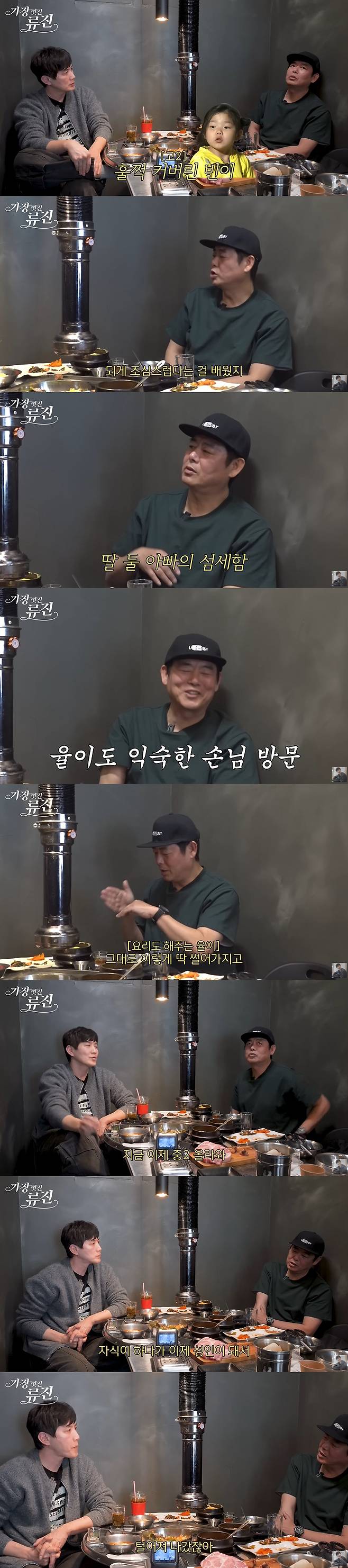 또한 성동일은 중학교 2학년이 된 막내 딸 성율에 대해 "사람들이 우리 집에 많이 오지 않나. 어느 날은 '엄마한테 냉장고에 꺼내서 좀 녹여놓으라 해'라고 했더니, 율이가 '몇 분 오냐'고 하더라"며 "어제도 2차로 보쌈, 연어회를 집에서 먹는데, 접시 긴 데다가 딱 썰어서 갖다 주더라. 안주를 잘 만들어온다"며 딸 생각에 환한 미소를 지으며 딸바보 면모를 자랑했다.