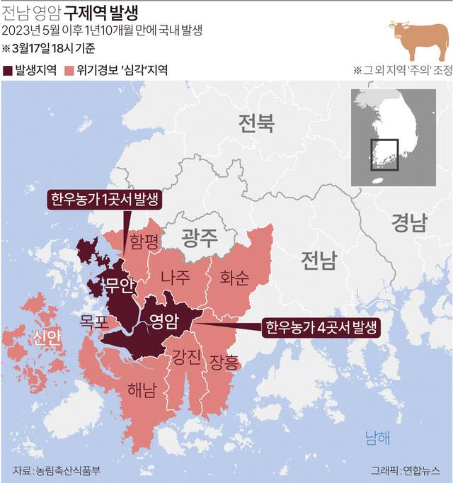 13일 전남 영암 한우농장에서 구제역이 발생한 후 전남 서부지역을 중심으로 질병 확산세가 심상찮다. 17일 오후 6시 기준 영암 4건, 무안 1건으로 확진농가만 5곳에 달했다. 전남에선 구제역이 사상 최초로 발생한 데다 짧은 시간 내 급속히 확산하는 양상을 보이면서 발생 원인을 놓고 의구심이 증폭되고 있다. 전문가들은 자율백신체계에 허점이 없는지 다시 한번 점검하고, 공항 입국자를 대상으로 한 방역활동을 강화해야 한다고 입을 모은다.