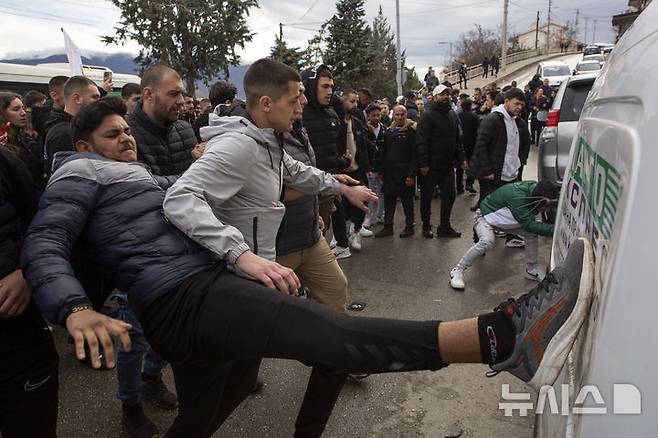 [코차니=AP/뉴시스] 17일(현지 시간) 북마케도니아 코차니에서 대형 화재가 발생한 나이트클럽의 소유주 자택 근처에서 열린 희생자 추모 집회 후 성난 시위대가 자동차를 발로 차고 있다. 이날 새벽 발생한 화재로 최소 59명이 숨진 것과 관련해 현지 당국은 허용 인원 250명의 두 배가 넘는 인원이 수용된 나이트클럽에 대해 뇌물 수수 의혹을 조사하고 있으며 15명을 구금했다고 밝혔다. 2025.03.18.