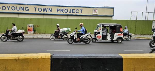 | ▲ 아침 이른 시간에 툭툭과 오토바이로 출근하는 프놈펜 사람들의 모습. 부영건설의 '사랑으로' 로고가 보인다. 한국 부영건설이 이곳에 대단위 아파트를 지어 분양하고 있다. |