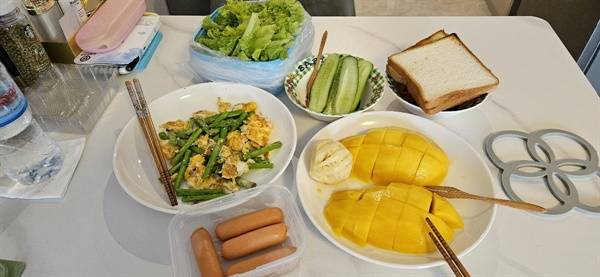 | ▲ 간단한 아침 식사. 끼니마다 김치처럼 빠지지 않고 망고 등 열대 과일이 식탁에 놓인다. |