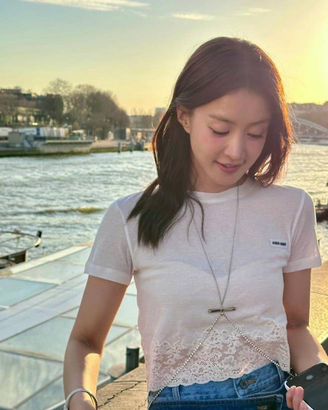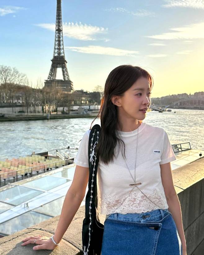 공개된 사진 속 그는 에펠탑을 배경으로 다양한 포즈를 취하며 편안한 분위기를 연출했다. 데님 팬츠와 스커트 세트에 흰색 레이스 반팔 상의를 매치, 기본에 충실한 스타일을 선보였다. 여기에 아기자기한 디테일이 가미된 숄더백을 더했다.