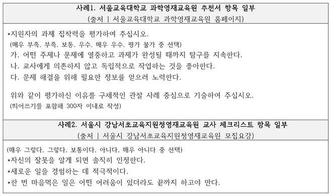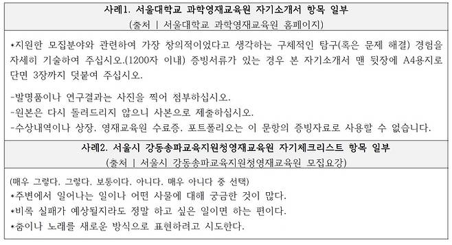 영재교육원 대비 학원 관계자는 "단순히 장점을 나열하는 것보다 문제 상황, 해결 과정, 결과 순서로 작성하면 더욱 입체적인 자기소개서가 된다"고 조언했다.