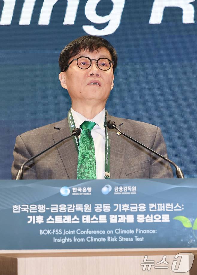 (서울=뉴스1) 허경 기자 = 이창용 한국은행 총재가 18일 서울 중구 한국은행 별관에서 열린 '한국은행-금융감독원 공동 기후 금융 컨퍼런스: 기후 스트레스 테스트 결과를 중심으로'에서 환영사를 하고 있다. 2025.3.18/뉴스1