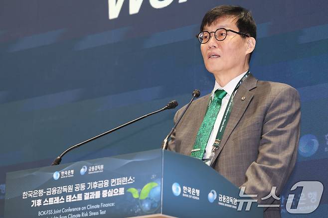 (서울=뉴스1) 허경 기자 = 이창용 한국은행 총재가 18일 서울 중구 한국은행 별관에서 열린 '한국은행-금융감독원 공동 기후 금융 컨퍼런스: 기후 스트레스 테스트 결과를 중심으로'에서 환영사를 하고 있다. 2025.3.18/뉴스1