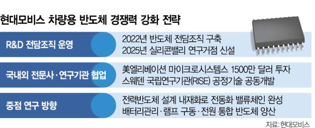 현대모비스는 올해 하반기 미국 실리콘밸리에 차량용 반도체 전문 연구 거점을 신설하고 국내와 해외에 각각 특화된 반도체 설계 기술을 개발할 예정이다. 현대모비스는 “글로벌 반도체 기업과 협업을 강화하고 해외 우수 인재를 확보해 나갈 예정”이라고 밝혔다.