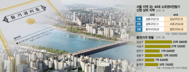 미래 투자 가치를 염두에 두면서도 30대는 출퇴근이 용이한 '직주근접' 가능 지역의 소유권이전등기 신청 비중이 높았고 40대는 '학군지'로 불리는 지역 내 등기 신청 비중이 높게 나타났다.