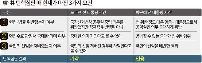 18일 법조계에 따르면 2004년 노무현 전 대통령 탄핵심판은 기각으로, 2017년 박근혜 전 대통령 탄핵심판은 인용으로 결과가 엇갈렸다. 두 전직 대통령의 운명을 가른 건 ‘헌법·법률 위반 여부’, ‘위반한 행위가 헌법수호 관점에서 중대한 의미가 있는지’, ‘국민의 신임을 저버렸는지’였다.