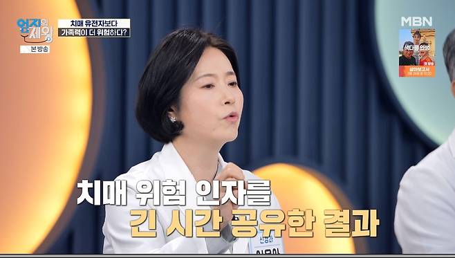 이에 대해 이은아 신경과 전문의는 "치매는 가족과 본인도 모르게 어릴 때부터 같은 환경, 같은 스트레스에 노출됐기 때문에 치매 위험 인자를 같이 공유한 세월이 길다"라며 "그만큼 더 잘 걸릴 수 있는 것"이라고 설명했다.