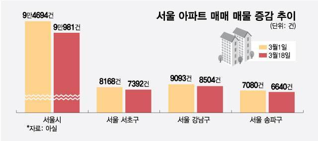 18일 부동산 빅데이터 업체 아실에 따르면 이날 기준 서울 아파트 매매 매물 건수는 9만981건으로 집계됐다.