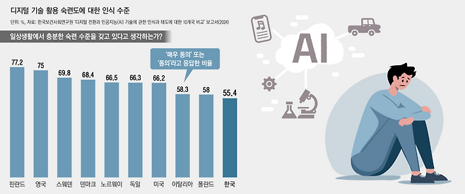한국인은 디지털 기술 관련 숙련도에 대해서도 가장 자신 없는 모습을 보였다. ‘일상생활에서 본인이 디지털 기술을 사용하는 데 충분한 숙련 수준을 가지고 있다고 생각하느냐’는 질문에 한국인의 55.4%만이 ‘그렇다’고 대답했다. 핀란드(77.2%), 영국(75%) 시민보다 훨씬 낮다. 업무 수행 관련 디지털 기술 숙련도를 묻는 질문에서도 한국인의 56.9%만이 ‘숙련도가 충분하다’고 답했다.