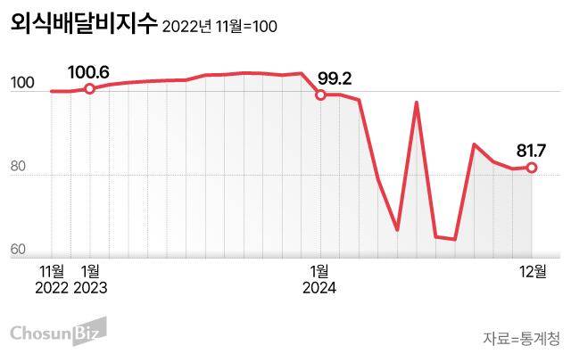 통계청은 2022년 11월 배달비를 기준(100)으로 삼고, 매 분기마다 3개월 치의 배달비지수를 공개한다. 외식배달비지수는 2023년에는 매월 꾸준히 상승세를 보이다가, 2024년부터는 하락세를 나타냈다. 특히 지난해 5월과 7월, 8월의 배달비 지수는 60선으로, 2022년 11월의 3분의 2 수준이었다.